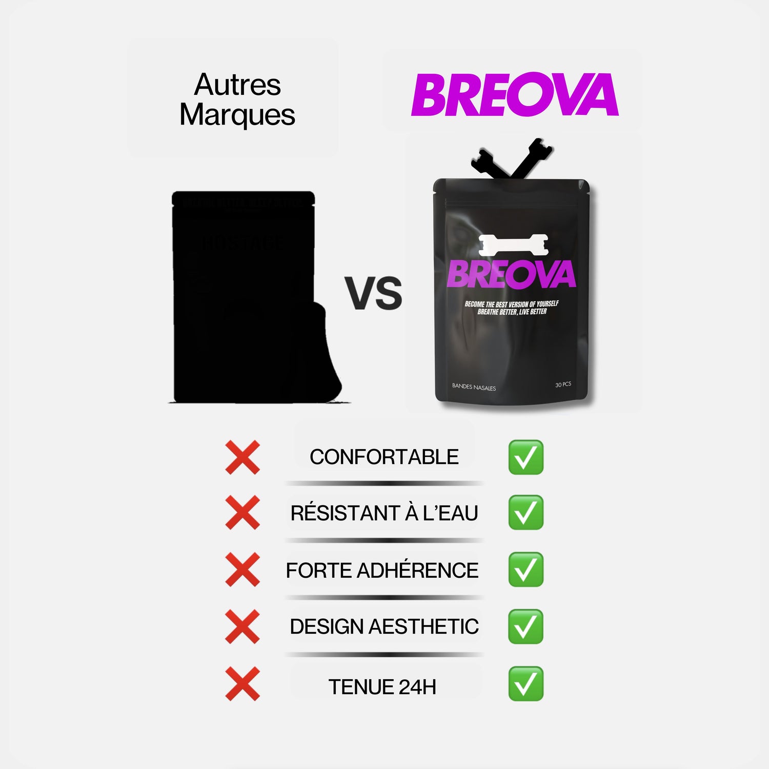 Les bandes nasales Breova soulèvent et ouvrent en douceur vos voies nasales, augmentant ainsi le flux d'air de 30 %. Cette augmentation de l'apport en oxygène améliore les performances, favorise une meilleure circulation sanguine et améliore les temps de récupération en augmentant l'absorption d'oxygène de 20 % !